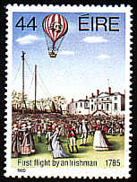 Irishman Richard Crosbie (1755-1800, born in Wicklow) launched at 2:30 p.m. from an exhibition area at Rangelagh Gardens in Dublin his "Grand Air Balloon and Flying Barge" in which he intended to cross the Irish Sea. The balloon was beautifully ornamented with paintings of Minerva and Mercury supporting the Arms of Ireland and emblematic figures of the winds. More than 35,000 people had gathered here to view the historical ascent. Due to early darkness Crosbie decided to break his attempt to cross the Irish Sea and he landed at Clontarf. Before this flight Crosbie experimented with various balloons and released several carrying various animals as passengers. Later he made some further attemps to cross Irish Sea but without success.
