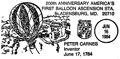 Inventor Peter Carnes built a tethered hot air balloon which ascended in Bladensburg. A 13-year-old boy, Edward Warren from Baltimore, is said to have been sent aloft in this balloon that was to small to carry its designer.