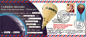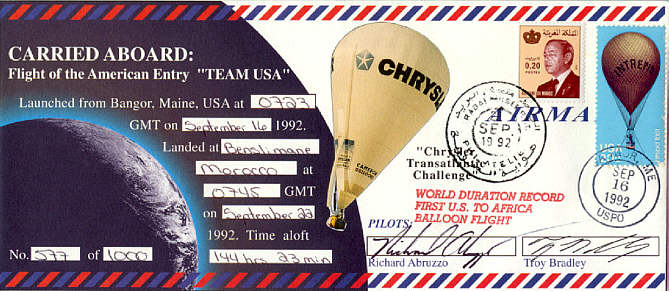 Americans Richard Abruzzo and Troy Bradley flew in "Chrysler 5" 6 days and 16 minutes from Bangor, Maine (USA) to near Casablanca Morocco in a Rozier balloon during the First Transatlantic Balloon Race.