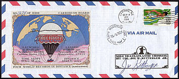 and flew 4 days 8 hours 14 min in the balloon "Pacific Peregrine" to Mendham, Saskatchewan (Canada)
