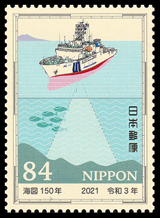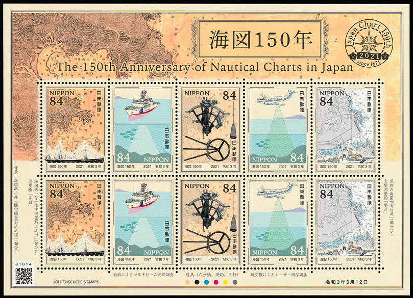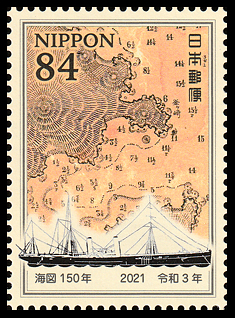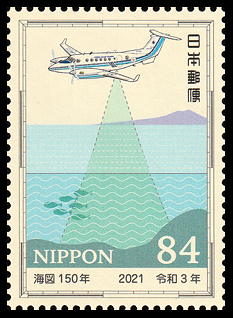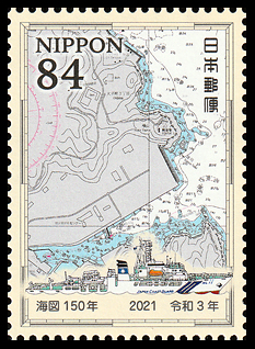 Zum 150. Jahrestag der Herstellung von nautischen Karten in Japan hat die japanische Post am 12. März 2021 einen Block mit fünf verschiedenen Briefmarkenmotiven herausgegeben. Sie zeigen von links nach rechts: Erste japanische Seekarte Rikuchu Kamaishi Hafenkarte und Vermessungsschiff „Kasuga“, Mehrstrahl-Echolotvermessung per Schiff, verschiedene Werkzeuge und Instrumente zur Seevermessung, u.a. ein Sextant, Vermessung über Lasersondierung durch ein Flugzeug, aktuelle Seekarte „Kamaishi Port“ und großes Vermessungsschiff „Peace“.