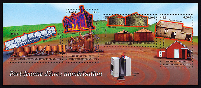 Terrestrisches Laserscanning: Das terrestrische Laserscanning (TLS) entwickelt sich seit einigen Jahren sehr intensiv und erobert immer mehr Anwendungsfelder, so auch die klasssche Vermessung. Ursprünglich wohl aus dem Bereich der Industrievermessung kommend (Vermessung zur Modellierung und Untersuchung von Maschinenbauteilen, Wehrzeugen etc) findet es heute auch zunehmend Anwendung in der Architekturvermessung (Bauforschung, Denkmalpflege), in Rohrleitungs- und Anlagebau, Tunelbau, Archäologie, Qualitätssicherung sowie in der Forensik und Unfallforschung. Auch immer mehr Vermesser greifen zu diesem Verfahren um z.B. im Bereich der Bau- und Ingenieurvermessung effizient Bauanlagen zu vermessen. Der Blockrand der TAAF-Ausgabe von 2012 zeigt einen Laserscanner der Firma Leica Geosystems (Leica HDS6000), mit dem Ende 2010 eine digitale Bestandsaufnahme der verfallenen Wallfang- und Verarbeitungsstation Port-Jeanne d'Arc (gegründet 1908 von den norwegischen Wallfängern und bestehend aus vier Wohngebäuden mit Wellblechdächern und Holzwänden, einem Stall, mehreren Heizkesseln und anderen technischen Anlagen) auf der Kerguelen-Hauptinsel durchgeführt wurde. Aus der Laseraufnahme wurde dann ein digitales 3D-Modell erstellt.