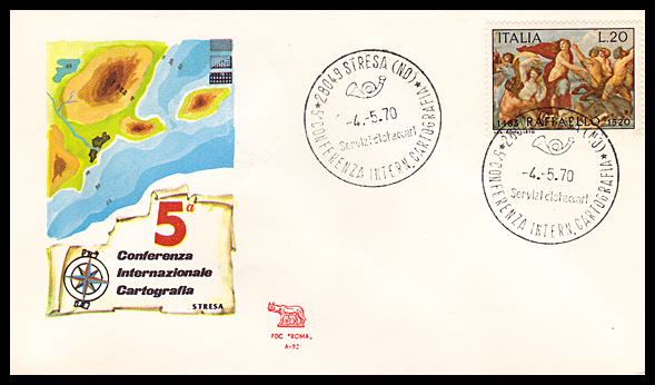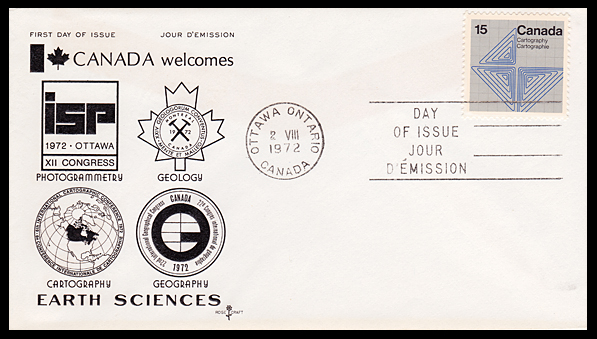 Die Internationale Kartographische Vereinigung - IKV (englisch: International Cartographic Association (ICA), französisch: Association Cartographique Internationale (ACI)) ist der weltweite Dachverband kartografischer Gesellschaften und anderer Einrichtungen. Ihr Ziel ist es, die Weiterentwicklung der Kartografie weltweit zu koordinieren. Die ICA wurde am 9. Juni 1959 in Bern, Schweiz, gegründet. Die erste Vollversammlung, bei der die Statuten angenommen wurden, fand 1961 in Paris statt. Der Schweizer Kartograf Eduard Imhof war der erste Präsident der ICA. Um die Arbeit weltweit zu koordinieren, gibt es Kommissionen und Arbeitsgruppen, die unter der Leitung von Fachkräften eine bestimmte Thematik bearbeiten. Kommissionen und Arbeitsgruppen werden jeweils für vier Jahre bestellt. Alle zwei Jahre veranstaltet die International Cartographic Association (ICA) Internationale Kartographische Konferenzen (ICC), die oft auch philatelistisch dokumentiert werden: 5. Internationale Kartographische Konferenz in Stresa, Italien, 3.-9. Mai 1970: ![]() ![]() 6. Internationale Kartographische Konferenz in Montreal und Ottawa, Kanada, 16.-25. August 1972: Im Jahr 1972 war Kanada Gastgeber von vier geowissenschaftlichen Kongressen aus den Berechen der Photogrammetrie, Kartographie, Geologie und Geographie. Die kanadische Post nahm dies zum Anlass, einen Satz mit vier Briefmarken herauszugeben, die den jeweiligen Geowissenschaften gewidmet sind (u.a. der Kartographie). Die FDC weist u.a. auf die 6. Internationale Kartographische Konferenz hin: